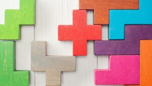 Concept of creative, logical thinking. Different colorful shapes wooden blocks on white wooden background, flat lay. Geometric shapes in different colors, top view. Abstract Background.