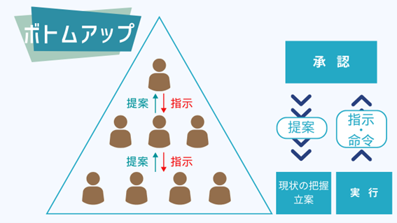 一方、ボトムアップは現場の従業員が計画立案や課題提案を行い、上層部がそれを承認して意思決定するスタイルです。現場に一定の裁量権が与えられ、組織の下層から意見やアイデアを吸い上げていくため、実態に即した細かな改善や革新が行いやすい点が特徴です。