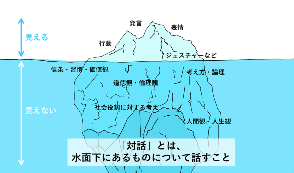 個人の意識は、本人にも自覚されていない部分が多く、知らず知らずのうちに変化しています。自分自身ですらつかめていない自分の意識を、他人が把握するのは困難です。対話をすることで、相手を理解すると同時に、無意識だった自分の価値観や考えに気がつくこともあるのです。