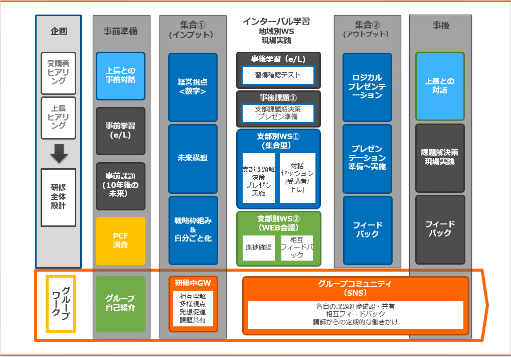 2回の集合研修のインターバル期間には対面とWEB会議の両方による支部別ワークショップを実施。集合研修での学びを実践に結び付けるために、受講者どうしが相互に学び合う機会を作り、受講者が主体的に学ぶアクションラーニングをより効果的に行うことができた。